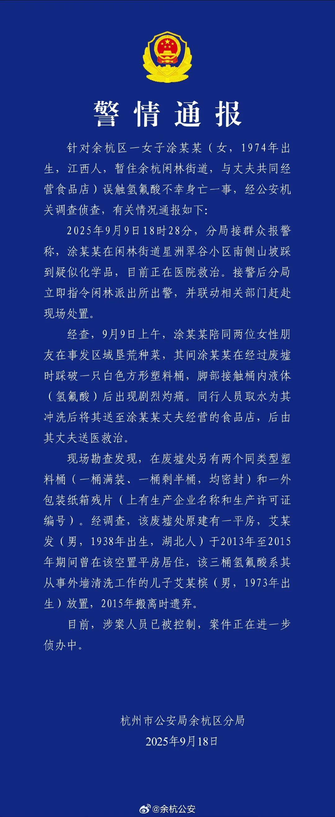 9月18日16時(shí)許,“@余杭公安”官方微博發(fā)布警情通報(bào)。經(jīng)查,9月9日上午,涂某某陪同兩位女性朋友在事發(fā)區(qū)域墾荒種菜,其間涂某某在經(jīng)過廢墟時(shí)踩破一只白色方形塑料桶,腳部接觸桶內(nèi)液體(氫氟酸)后出現(xiàn)劇烈灼痛。同行人員取水為其沖洗后將其送至涂某某丈夫經(jīng)營(yíng)的食品店,后由其丈夫送醫(yī)救治?,F(xiàn)場(chǎng)勘查發(fā)現(xiàn),在廢墟處另有兩個(gè)同類型塑料桶(一桶滿裝、一桶剩半桶,均密封)和一外包裝紙箱殘片(上有生產(chǎn)企業(yè)名稱和生產(chǎn)許可證編號(hào))。經(jīng)調(diào)查,該廢墟處原建有一平房,艾某發(fā)(男,1938年出生,湖北人)于2013年至2015年期間曾在該空置平房居住,該三桶氫氟酸系其從事外墻清洗工作的兒子艾某檳(男,1973年出生)放置,2015年搬離時(shí)遺棄。目前,涉案人員已被控制,案件正在進(jìn)一步偵辦中。