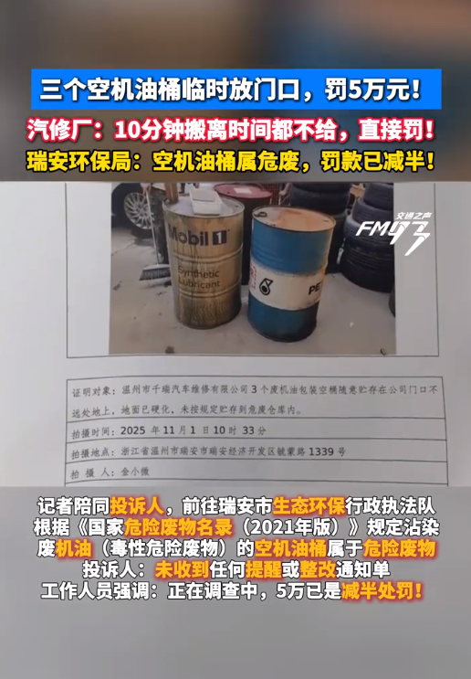 11月4日,據(jù)溫州市新聞傳媒中心《溫州晚間報道》欄目報道,溫州瑞安一汽修店負責人彭先生求助稱,近日因廠里地面做地坪漆,臨時將三個空機油桶挪到門口,11月1日瑞安市生態(tài)環(huán)保行政執(zhí)法隊到店檢查,當場對此定性為“隨意擺放危險廢物”,直接通知要對該違法行為處罰5萬元,執(zhí)法人員稱“簽字認罰5萬、不簽字則罰10萬”。彭先生認為處罰過重,無法接受。