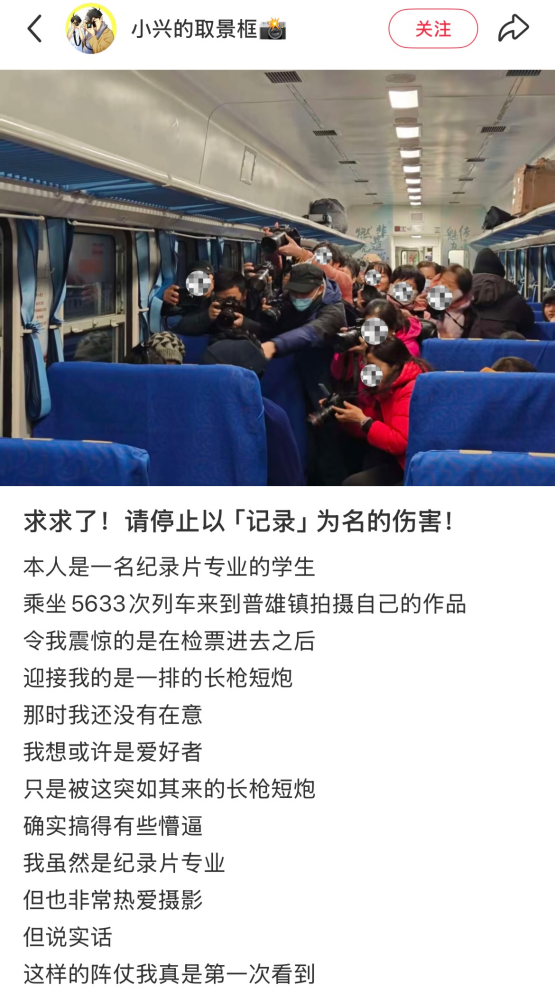 11月19日20時(shí)許,小紅書網(wǎng)民“@小興的取景框”發(fā)帖稱,自己在乘坐5633次列車前往普雄鎮(zhèn)的途中,在車廂內(nèi)遇到一攝影團(tuán)手持“長(zhǎng)槍短炮”不停走動(dòng),并不顧被拍攝者意愿圍著一個(gè)人拍攝,呼吁停止以“記錄”為名的傷害,不少網(wǎng)民留言認(rèn)為這是冒犯被拍攝者的“鏡頭霸凌”行為。