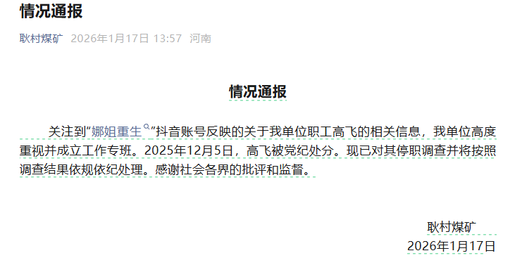 1月17日,男方單位通過“耿村煤礦”微信公眾號發(fā)布情況通報稱,關(guān)注到相關(guān)信息,單位高度重視并成立工作專班。2025年12月5日,高某被黨紀處分?,F(xiàn)已對其停職調(diào)查并將按照調(diào)查結(jié)果依規(guī)依紀處理。另據(jù)“@二三里資訊”報道,高某被停工,韓某已從原部門調(diào)至洗煤廠工作。