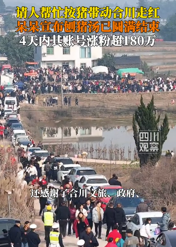 1月9日凌晨,來(lái)自重慶合川的抖音博主“呆呆”發(fā)視頻稱(chēng),1月11日家中要?dú)深^豬,因?yàn)楦改改挲g大了按不住,希望有人幫忙按豬,將請(qǐng)吃刨豬湯答謝,“呆呆”還開(kāi)玩笑稱(chēng)“就想家門(mén)口停滿(mǎn)車(chē),在村里揚(yáng)眉吐氣一回”。短短兩日,視頻點(diǎn)贊量突破18萬(wàn),轉(zhuǎn)發(fā)量超14萬(wàn),“呆呆”建立的6個(gè)500人的“刨豬湯”群很快滿(mǎn)員。盡管“呆呆”連夜采購(gòu)食材并報(bào)備派出所,但已無(wú)法阻止網(wǎng)民熱情。1月10日凌晨,合川文旅緊急抽調(diào)工作人員趕赴現(xiàn)場(chǎng),協(xié)助保障活動(dòng)順利進(jìn)行。1月11日,來(lái)自全國(guó)各地超4000名網(wǎng)民匯聚“呆呆”家鄉(xiāng),其中不乏“鹵鵝哥”等知名網(wǎng)紅。1月11日至12日,“呆呆”連開(kāi)多場(chǎng)直播,邀請(qǐng)網(wǎng)民參加家鄉(xiāng)大聯(lián)歡,直播間觀(guān)看和點(diǎn)贊人數(shù)均超3000萬(wàn)人次。在合川文旅、愛(ài)心企業(yè)、網(wǎng)民等多方贊助下,原計(jì)劃的兩頭豬增至五頭,現(xiàn)場(chǎng)設(shè)五個(gè)分會(huì)場(chǎng)分散人流,公安部門(mén)疏導(dǎo)交通。合川文旅部門(mén)帶著本地特產(chǎn)、景區(qū)門(mén)票到現(xiàn)場(chǎng),講解“刨豬宴”和合川歷史文化,還設(shè)置篝火、煙花、舞龍等環(huán)節(jié)。據(jù)現(xiàn)場(chǎng)網(wǎng)民透露,當(dāng)?shù)匾还矓[了300桌宴席,最多時(shí)同時(shí)有超3000人。該事件引發(fā)熱烈討論,“殺豬女孩呆呆一天漲粉150萬(wàn)”“呆呆殺豬宴一天蒸1000多斤大米”等多個(gè)話(huà)題沖上社交平臺(tái)熱搜。