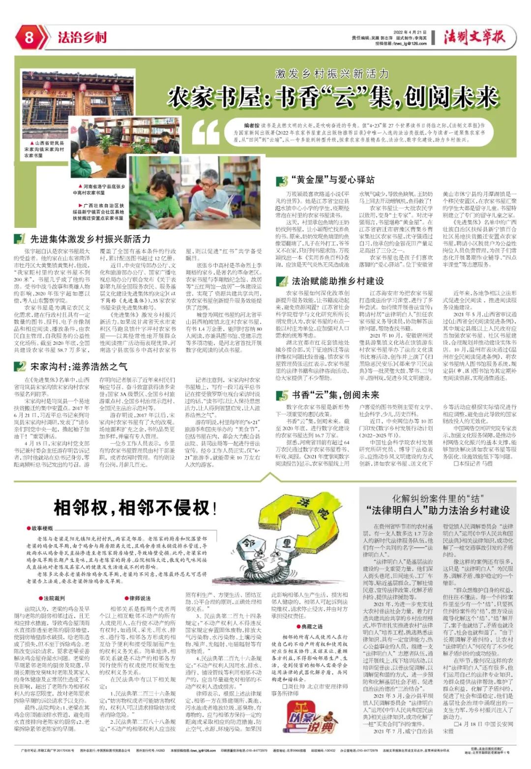 讀書(shū)是點(diǎn)燃文明的火炬,是吹響奮進(jìn)的號(hào)角。值“4·23”第27個(gè)世界讀書(shū)日將臨之際,《法制文萃報(bào)》作為國(guó)家新聞出版署《2022年農(nóng)家書(shū)屋重點(diǎn)出版物推薦目錄》中唯一入選的法治類(lèi)報(bào)紙,今與讀者一道聚焦農(nóng)家書(shū)屋,從“田間”到“云端”,從一專(zhuān)多能到轉(zhuǎn)型升級(jí),探索農(nóng)家書(shū)屋精品化、法治化、數(shù)字化建設(shè),助力鄉(xiāng)村振興。