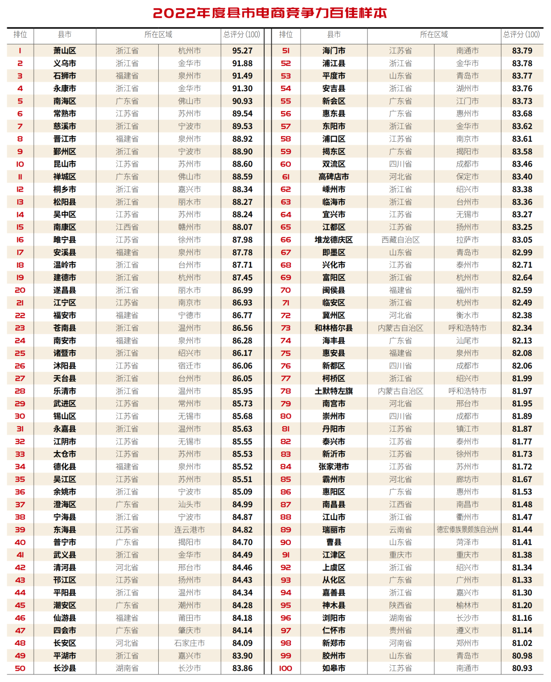 作為數(shù)字經(jīng)濟(jì)的一種形態(tài),縣域電商不僅是人們增收致富的重要渠道,也是驅(qū)動地方產(chǎn)業(yè)發(fā)展,甚至盤活整個縣域經(jīng)濟(jì)的一把利器。2022年5月,“2022年度縣市電商競爭力百佳樣本”榜單重磅發(fā)布,浙江省杭州市蕭山區(qū)、浙江省金華市義烏市、福建省泉州市石獅市、浙江省金華市永康市、廣東省佛山市南海區(qū)、江蘇省蘇州市常熟市、浙江省寧波市慈溪市、福建省泉州市晉江市、浙江省寧波市鄞州區(qū)、江蘇省蘇州市昆山市位列前十。