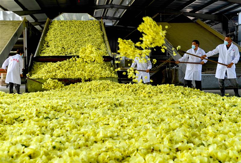 9月18日,在安徽省亳州市利辛縣王市鎮(zhèn)高寨村廣焱家庭農場,村民在整理剛采收的黃蜀葵花。劉勤利攝