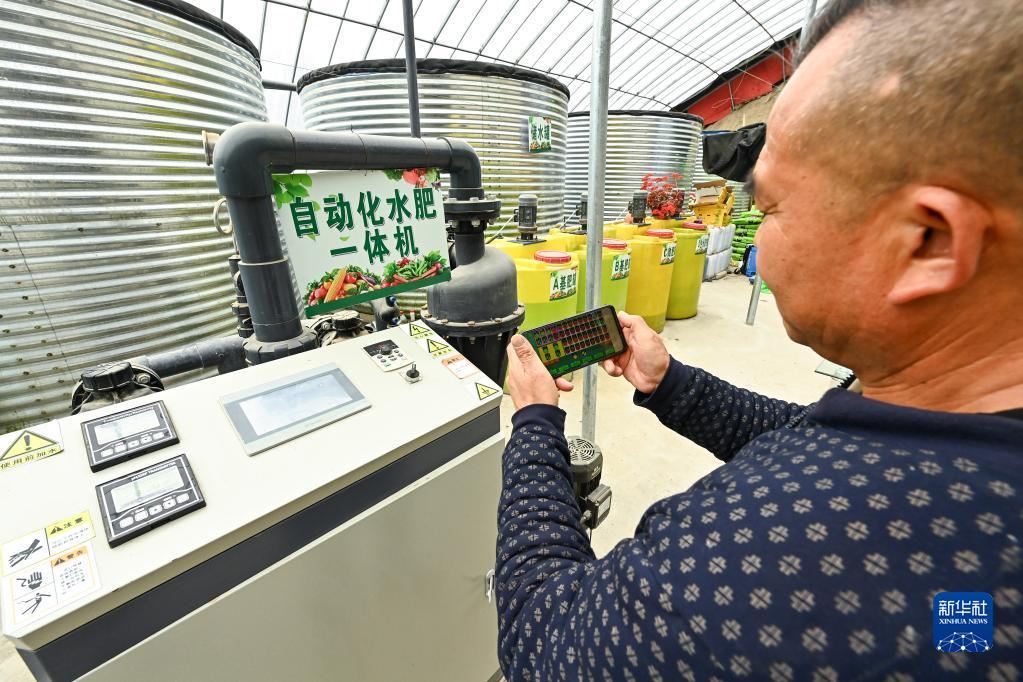 現代設施農業(yè)示范基地的管理人員通過手機控制自動化水肥一體機。記者 丁磊 攝