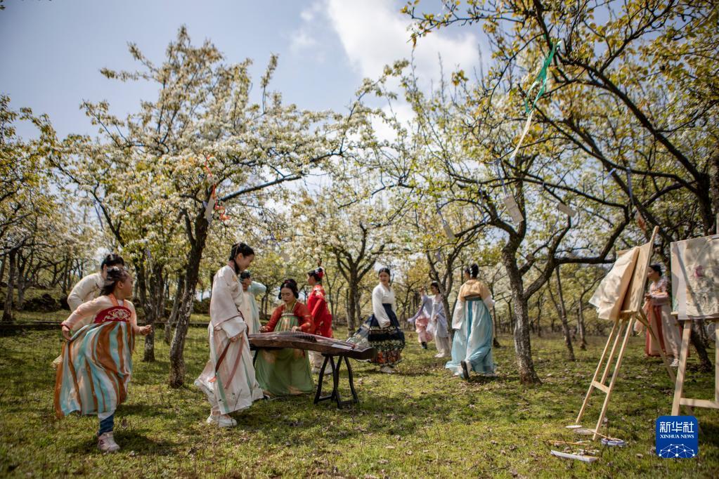 4月1日,幾名古裝愛好者穿著古裝在秀山縣溶溪鎮(zhèn)梨園村梨園內(nèi)嬉戲。胡程 攝