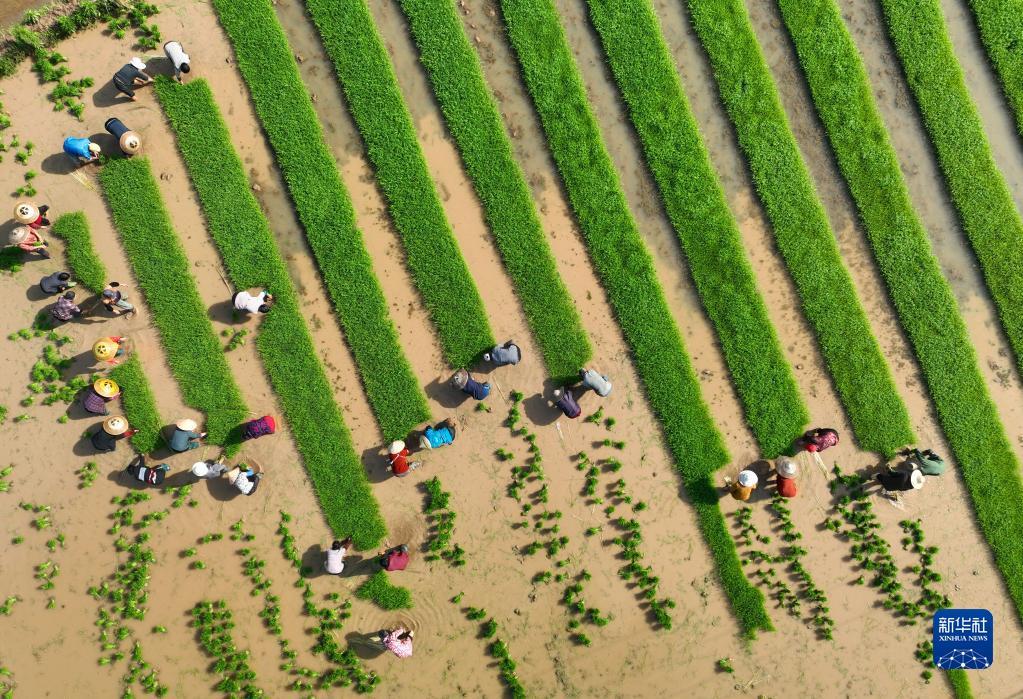 4月16日,湖南省衡陽(yáng)市祁東縣金橋鎮(zhèn)村民在扯秧(無(wú)人機(jī)照片)。曹正平 攝