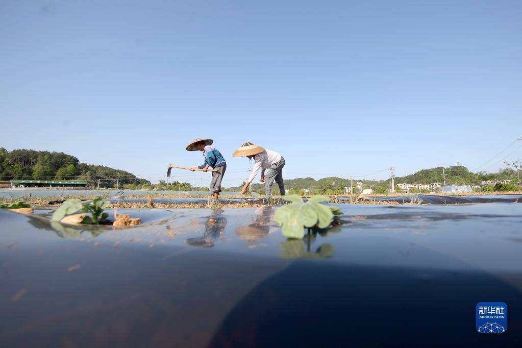 4月16日,貴州省銅仁市玉屏侗族自治縣新店鎮(zhèn)沙水坪村村民在西瓜地里蓋膜。劉德軍 攝