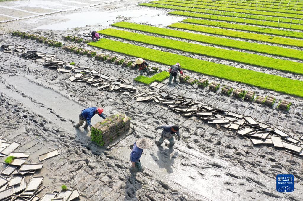 4月16日,浙江省樂(lè)清市城東街道農(nóng)民在搬運(yùn)秧苗(無(wú)人機(jī)照片)。蔡寬元 攝