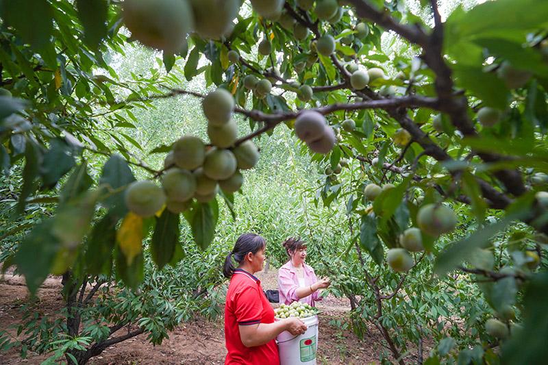 7月6日,山東省鄒平市西董街道南洞村的青李聯(lián)合農(nóng)場,游客和果農(nóng)在采摘青李。
