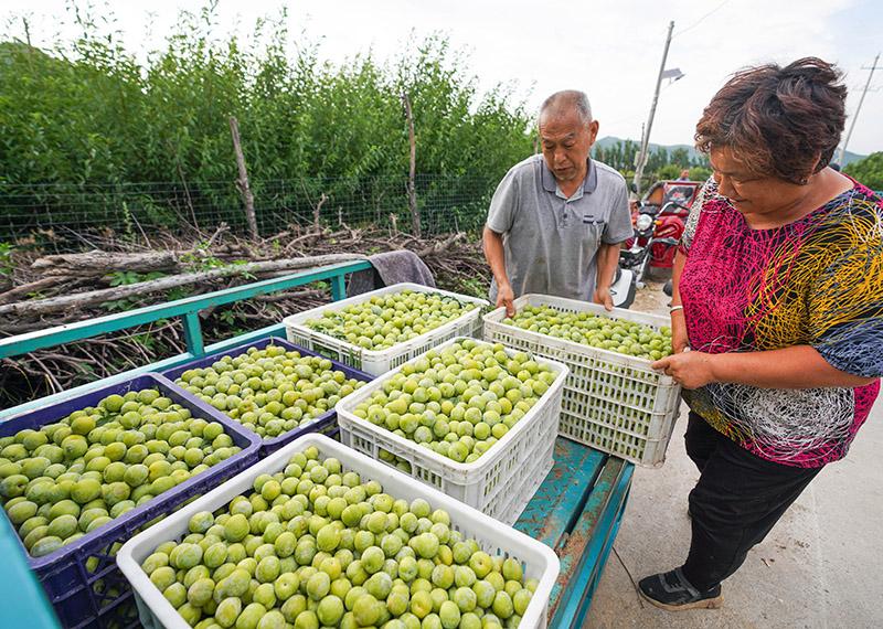 7月6日,山東省鄒平市西董街道南洞村的青李聯(lián)合農(nóng)場,果農(nóng)整理采摘的青李。