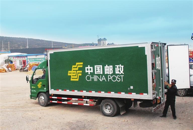 工作人員卸載郵車(chē)上的農(nóng)特產(chǎn)品