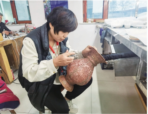 近日,饒陽縣億澤景泰藍工藝品廠內(nèi),脫貧群眾正在為景泰藍填充色釉(資料圖)