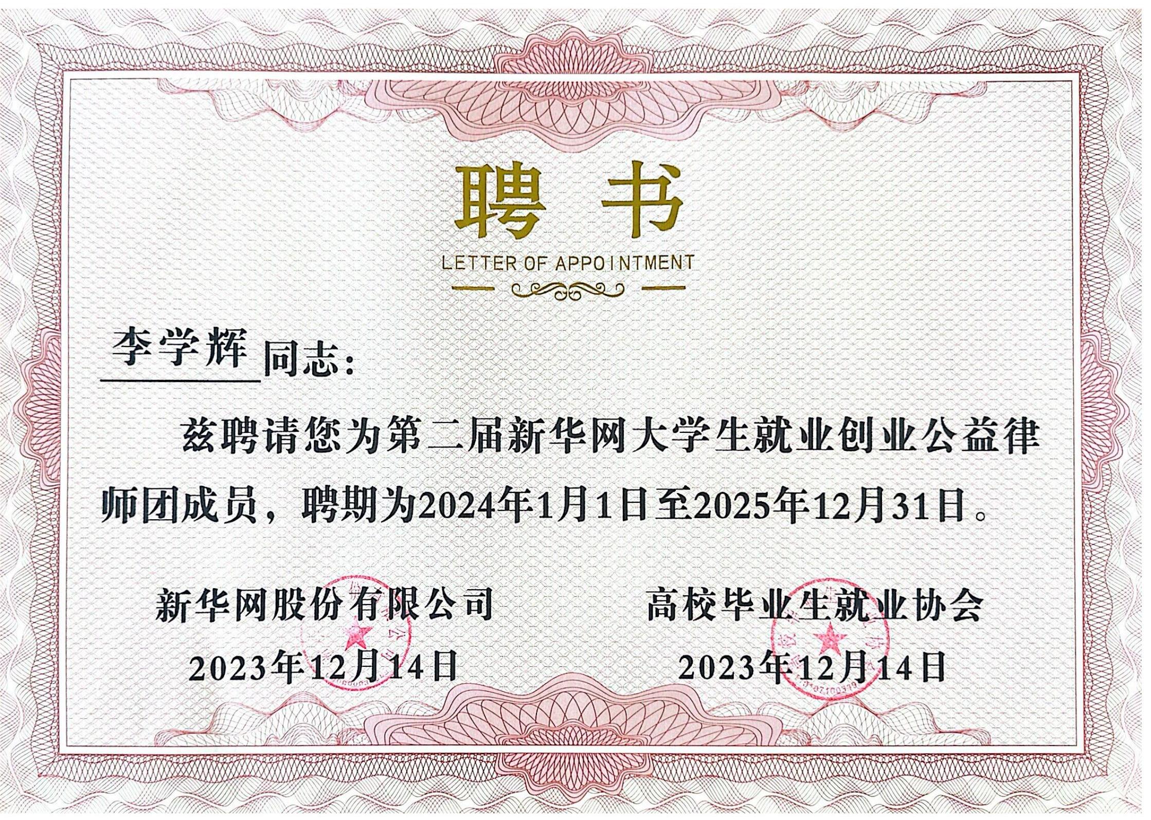 北京市安理律師事務(wù)所黨委副書(shū)記、管委會(huì)委員李學(xué)輝律師憑借扎實(shí)的法律功底、過(guò)硬的專業(yè)素養(yǎng)、應(yīng)有的責(zé)任擔(dān)當(dāng),受聘擔(dān)任新華網(wǎng)大學(xué)生就業(yè)創(chuàng)業(yè)公益律師團(tuán)成員。