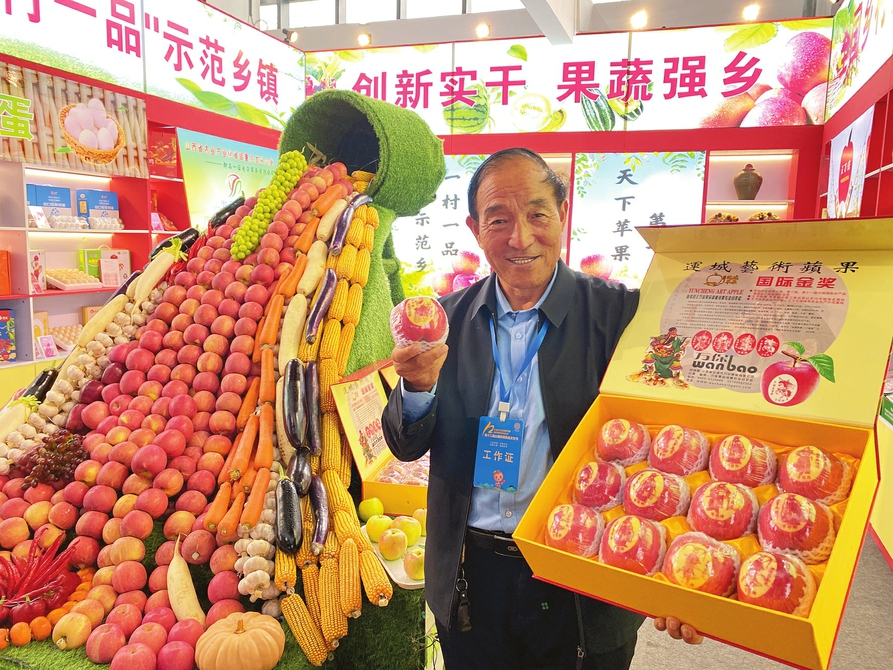 社長(zhǎng)王萬(wàn)保在展示合作社文化藝術(shù)蘋(píng)果 張新征 攝