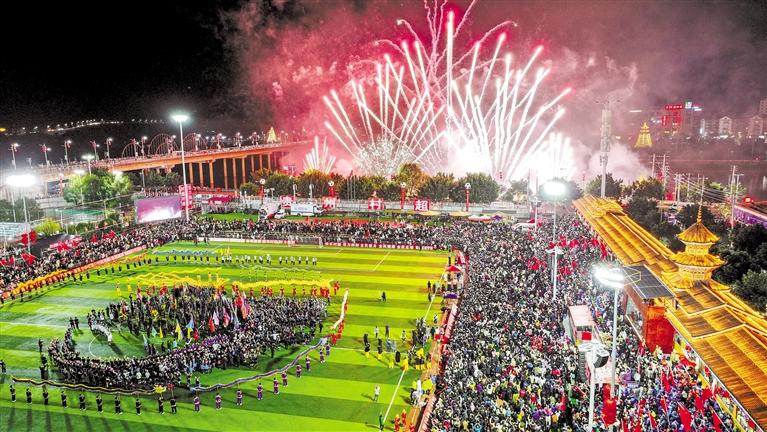 19時(shí)30分,澳門職工聯(lián)隊(duì)與貴州村超聯(lián)隊(duì)友誼賽結(jié)束后,“村超村晚”文藝展示又將整場(chǎng)活動(dòng)推向高潮。這場(chǎng)晚會(huì)由民風(fēng)民俗展新顏、鄉(xiāng)村足球超快樂、貴山貴水迎貴客、龍騰盛世慶豐年4個(gè)篇章組成,參演演員近2300人。據(jù)相關(guān)負(fù)責(zé)人介紹,此次文藝展示的內(nèi)容均以榕江“村超”自創(chuàng)節(jié)目為主,同時(shí),澳門舞醉龍表演隊(duì)在龍騰盛世慶豐收環(huán)節(jié)與貴州的舞龍隊(duì)伍共同演出,展示出兩地文化的互通互融。本次文藝展示強(qiáng)調(diào)“草根”和民族文化,吸引了上萬(wàn)人現(xiàn)場(chǎng)觀看,在演出的尾聲,一場(chǎng)持續(xù)10余分鐘的煙花秀點(diǎn)亮了榕江縣的夜空,“文化味、民族味、傳承味、年味”十足的“村超村晚”在觀眾和游客的掌聲與歡呼聲中落下帷幕。