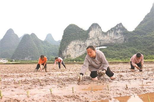 4月18日,走進(jìn)平樂縣青龍鄉(xiāng)偃月山下村的百畝香芋示范種植基地,只見芋農(nóng)們正忙著給新栽種的香芋施肥。
