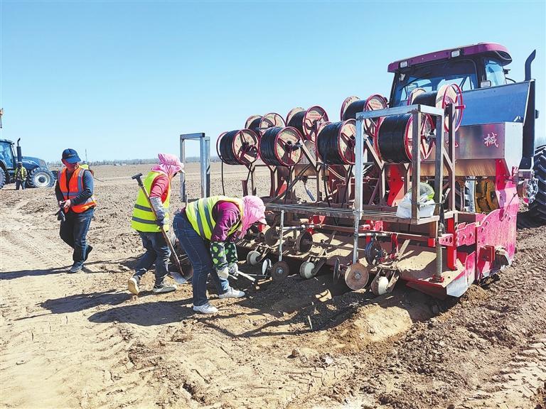 黃羊河農(nóng)場職工在調(diào)試滴灌農(nóng)機(jī)設(shè)備 記者 王朝霞