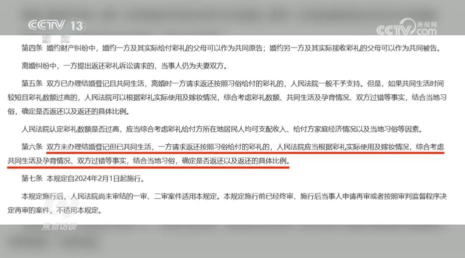 陜西省韓城市人民法院芝陽人民法庭庭長王春妮:“我們跟原告充分釋法明理,讓他知道咱們國家有新的規(guī)定,對他經(jīng)過反復做工作,他也降低了自己的心理預期。被告這邊認為我跟你在一起共同生活了,我也是實心想跟你過日子,但是因為沒有領(lǐng)證,而且我還跟你共同生育了一個孩子,你現(xiàn)在要求我給你返還彩禮,我就不愿意返還,心里有抵抗情緒?!?br/>