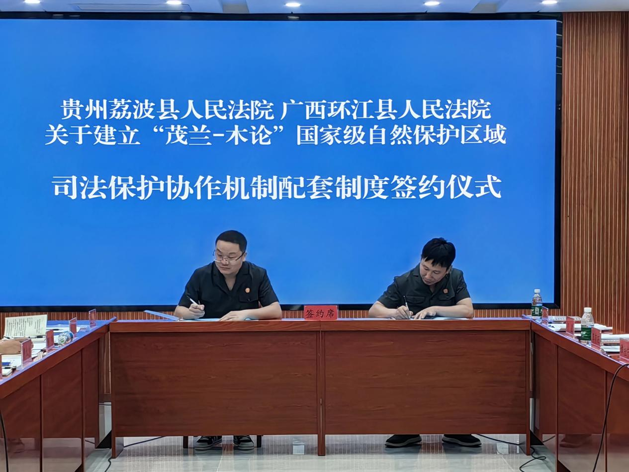 2022年10月,貴州省荔波縣人民法院、廣西環(huán)江毛南族自治縣人民法院在茂蘭法庭共同簽署了《茂蘭-木論國(guó)家級(jí)自然保護(hù)區(qū)跨區(qū)域司法保護(hù)協(xié)作機(jī)制框架協(xié)議》,拉開(kāi)了黔桂兩省區(qū)生態(tài)保護(hù)跨區(qū)域司法保護(hù)協(xié)作的序幕。