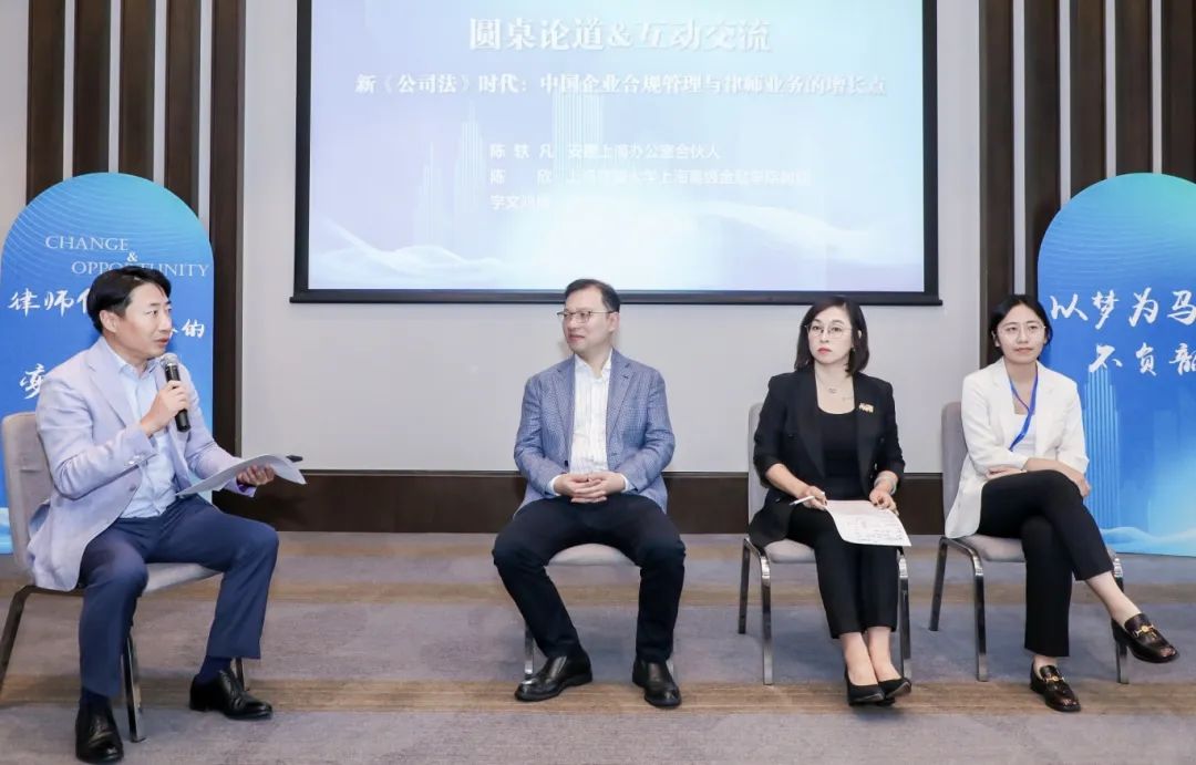 新《公司法》的實施為企業(yè)合規(guī)管理設(shè)置了很多新的課題,亦為律師展業(yè)提供了許多新的機(jī)會。為此,青年律師該如何“借勢”,化挑戰(zhàn)為機(jī)遇,實現(xiàn)個人成長?圍繞此話題,陳欣教授、安理合伙人宇文鴻雁律師、青年律師代表劉豆律師給出了諸多有益建議。陳軼凡律師擔(dān)任本環(huán)節(jié)主持。