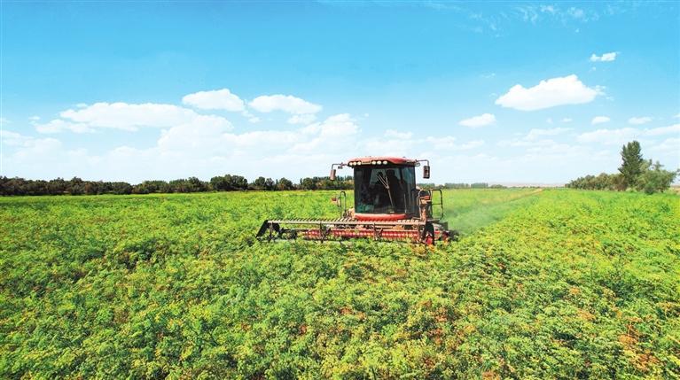 但見地里的苜蓿有高有低、呈波浪狀?!澳闱?,我們農(nóng)場進行植株高低搭配,將個頭較高的WJ363HK苜蓿與個頭低的阿蒂娜間作套種,當苜蓿大面積開花時,能充分享受陽光,提高苜蓿牧草的粗蛋白含量。”趙富強說著算了一筆賬:今年6月10日到20日,頭茬苜蓿成熟,19臺大型機械搶趕時間,一個多星期就收割結束,保障了粗蛋白含量高達20%以上;目前第二茬苜蓿只有40厘米高,長到7月下旬80厘米左右即可收割;第三茬苜蓿到9月中下旬時收割。1畝苜蓿收割3茬、可產(chǎn)900公斤至1噸干草,按照目前市場價1噸干草1600至1800元計算,收益可觀。