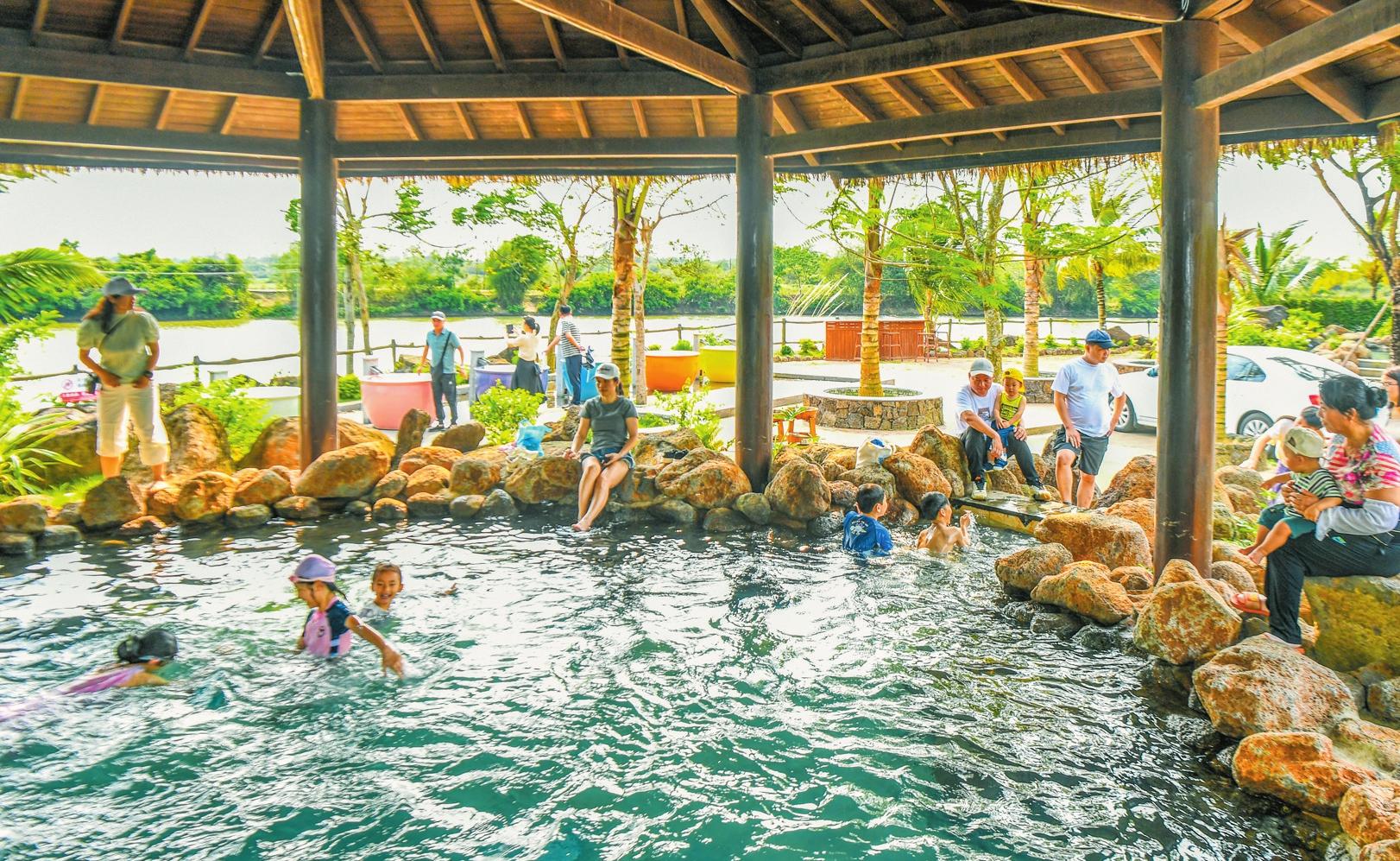 家長帶孩子在龍華區(qū)新坡鎮(zhèn)潭豐洋火山濕地農莊泡冷泉 記者 康登淋 攝