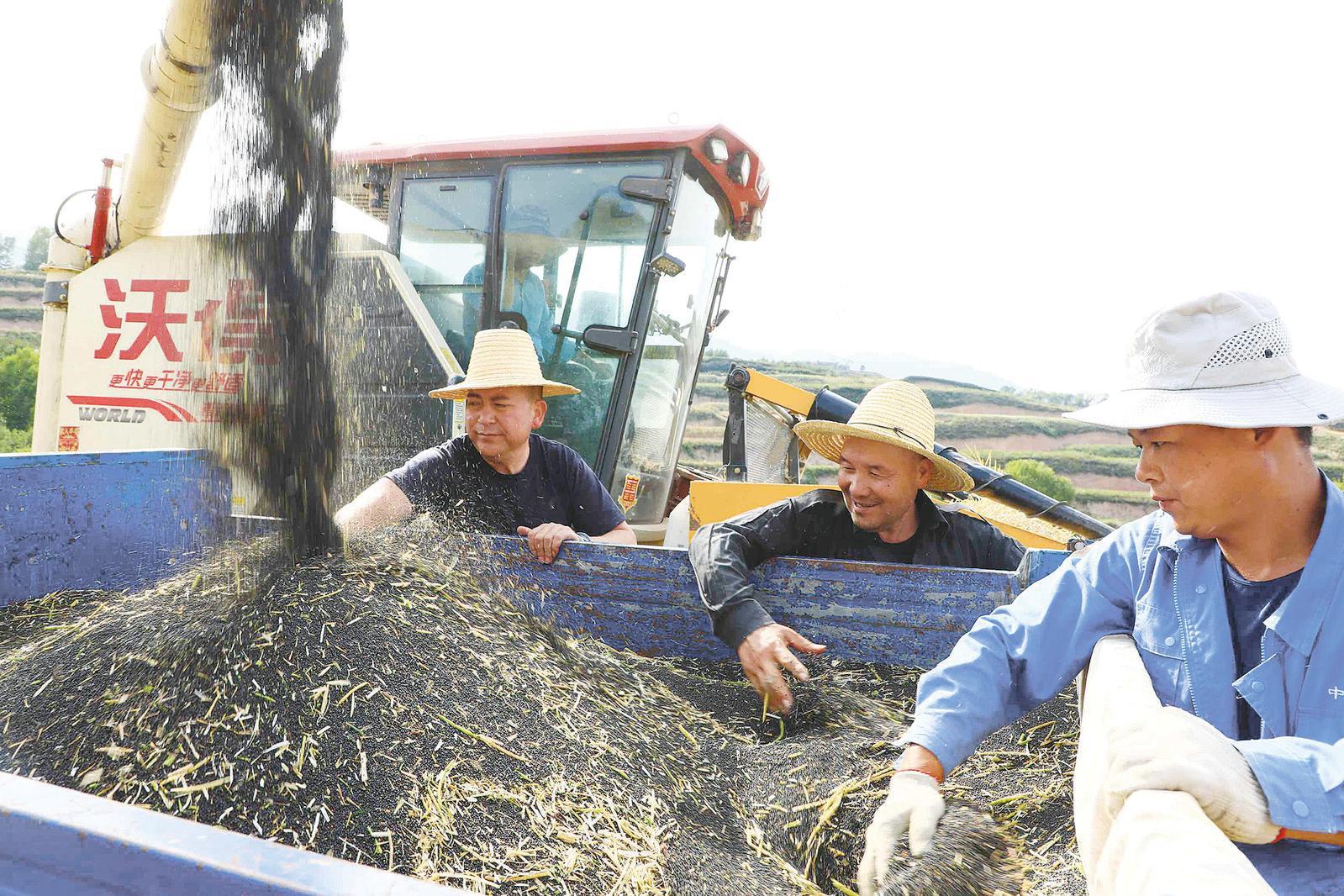 在一處坡洼的田塊里,一臺(tái)聯(lián)合收割機(jī)正在卸糧,收獲的油菜籽從卸糧口傾瀉而下,倒入三輪車斗里?!斑@塊田以前是撂荒地,我們合作社流轉(zhuǎn)后種植了油菜。今年雨水好,看莊稼長(zhǎng)勢(shì),油菜籽畝均產(chǎn)量至少在150公斤以上?!睆埣仪f村黨支部書記張斌先和村支部委員寧智祥捧起一把黑黝黝的油菜籽,臉上露出收獲的喜悅。