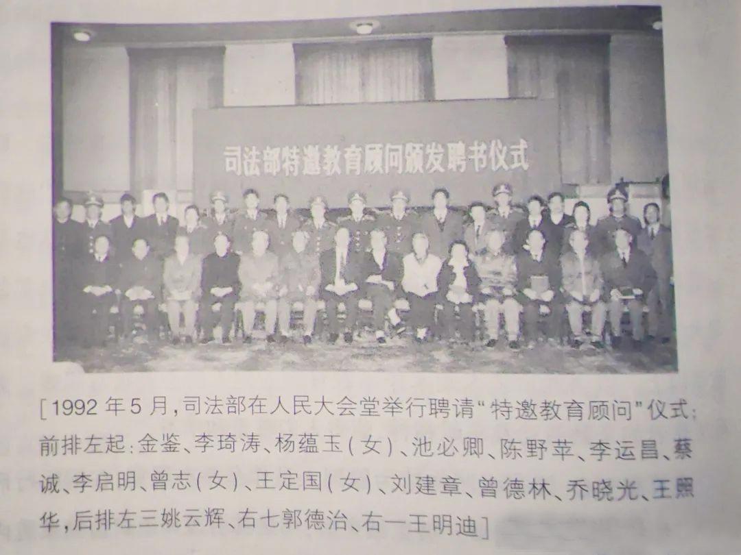 1992年5月,司法部會同中國關心下一代工作委員會,聯(lián)合聘請陳野蘋、曾志、王照華、池必清、喬曉光、李啟明、李運昌、劉建章、何光、曾德林、楊蘊玉、張文松、李琦濤、王定國等十四位老同志擔任“司法部特邀教育顧問”,并在人民大會堂舉行了隆重的頒發(fā)聘書儀式。在這批德高望重的革命前輩的熱情參與下,監(jiān)獄管理機關的教育改造質(zhì)量和社會影響力有了新的提升。由于工作原因,我有幸親歷和見證了他們到監(jiān)獄開展幫教活動的一幕幕感人至深的場景。