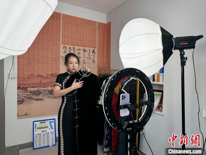 連日來,在臨海涌泉鎮(zhèn)甜美共富工坊的共享直播間里,“00后”姑娘尹夢莎忙著直播帶貨。依托當?shù)貎?yōu)質的旗袍資源,自2022年從業(yè)以來,她已積累了3萬多名粉絲。