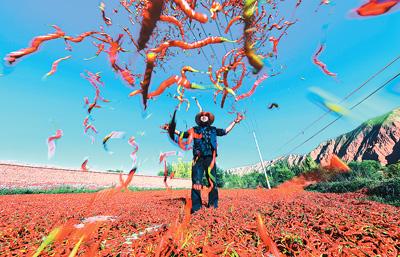 青海省海東市循化撒拉族自治縣清水鄉(xiāng)多灘地、谷地,全年日照充足,出產的線辣椒色澤鮮紅,“香而不辣,口味獨特”,受到大眾喜愛。正是豐收時節(jié),清水鄉(xiāng)家家戶戶在房前屋后晾曬線辣椒,構成一幅喜人的秋日圖景。