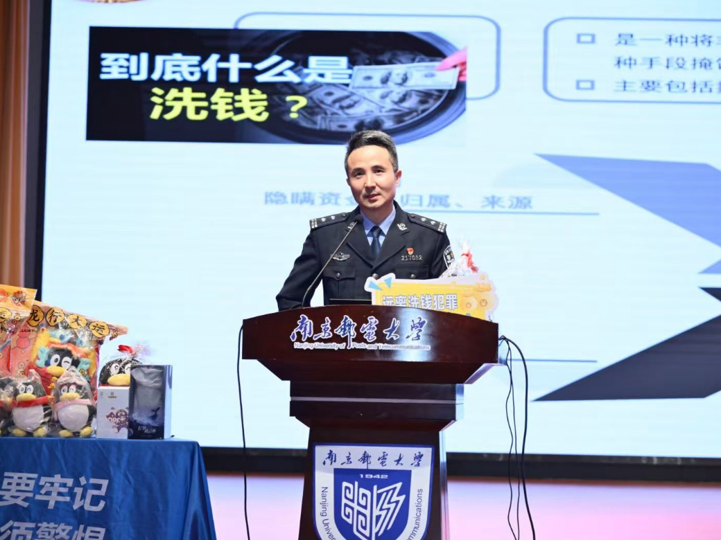 在主題宣講中,南京市公安局經(jīng)偵支隊(duì)第一偵查大隊(duì)教導(dǎo)員張熙以典型案例為切入點(diǎn),向同學(xué)們?cè)敿?xì)、生動(dòng)地講解了洗錢的基本概念、不同形式的犯罪手段以及反洗錢的重要意義。洗錢犯罪活動(dòng)不僅嚴(yán)重破壞金融秩序,還可能導(dǎo)致個(gè)人信息泄露、財(cái)產(chǎn)受損,要時(shí)刻保持警惕。