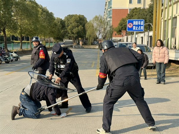 演練期間,一名佯裝以探視幼兒為借口的“歹徒”,手持器械妄圖強行闖入校園。面對這一“不速之客”,校園保安迅速反應(yīng),當(dāng)即對歹徒予以勸阻,并即刻啟動一鍵報警系統(tǒng)向公安機關(guān)報警,同時向園內(nèi)應(yīng)急指揮部匯報情況。相關(guān)責(zé)任教師在警報拉響后,迅速且有條不紊地將正在戶外開展活動的幼兒疏散至安全地帶。應(yīng)急小組、校園保安與在場民警緊密協(xié)作,運用防暴盾牌筑起堅固防線進行格擋防御,借助鋼叉巧妙干擾歹徒的行動。憑借彼此間的高度默契配合,逐步縮小對歹徒的包圍圈。在全體現(xiàn)場人員的齊心協(xié)力之下,最終成功將歹徒制服。整個演練流程各個環(huán)節(jié)緊密銜接、有條不紊,順利達成預(yù)期目標(biāo)。