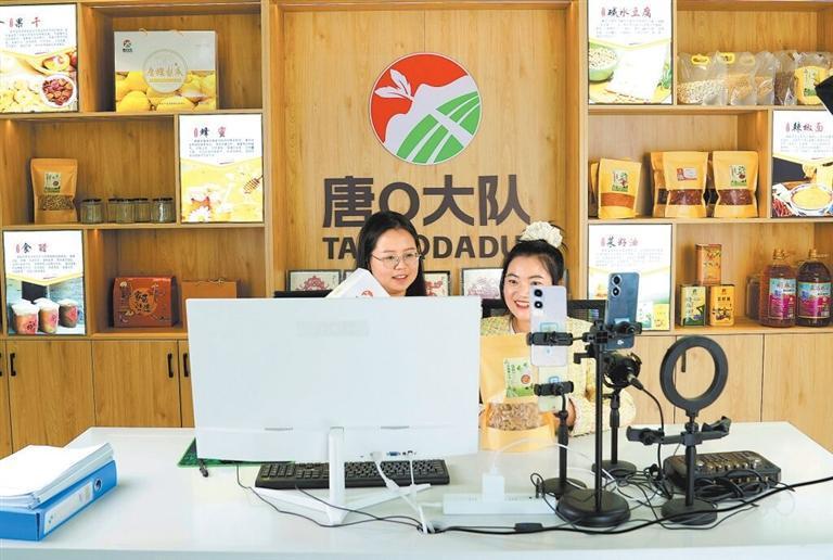 合水縣西華池鎮(zhèn)唐旗村“唐Q大隊(duì)”助農(nóng)工作室通過網(wǎng)絡(luò)直播推介銷售農(nóng)特產(chǎn)品。通訊員 陸洋