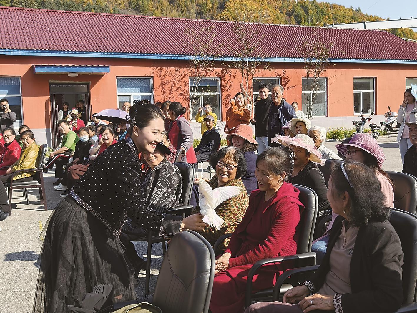 在文藝志愿服務(wù)惠民演出中,文藝志愿者與當(dāng)?shù)卮迕裼H密互動。記者 郭悅 攝