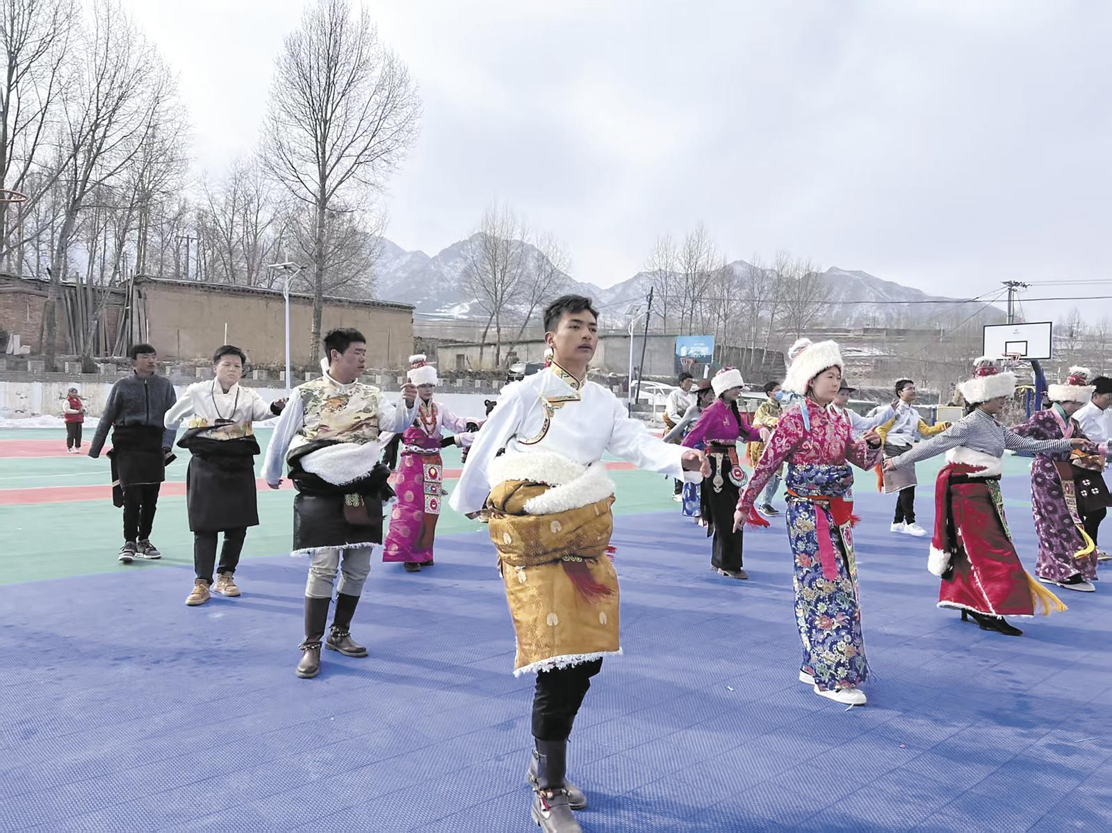暮色漸深,村里的文化廣場上熱鬧起來,篝火旁,身穿傳統(tǒng)藏袍的姑娘們跳起歡快的鍋莊舞,長袖飄飄、舞步輕盈,小伙子們則展示著高亢激昂的藏族民歌,大家說說笑笑,沉浸在優(yōu)美的歌聲和幸福的生活里。