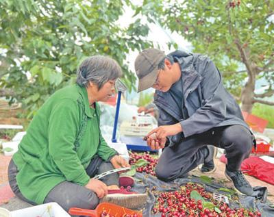 姜利紅(右)幫村民挑選櫻桃。姜健 攝