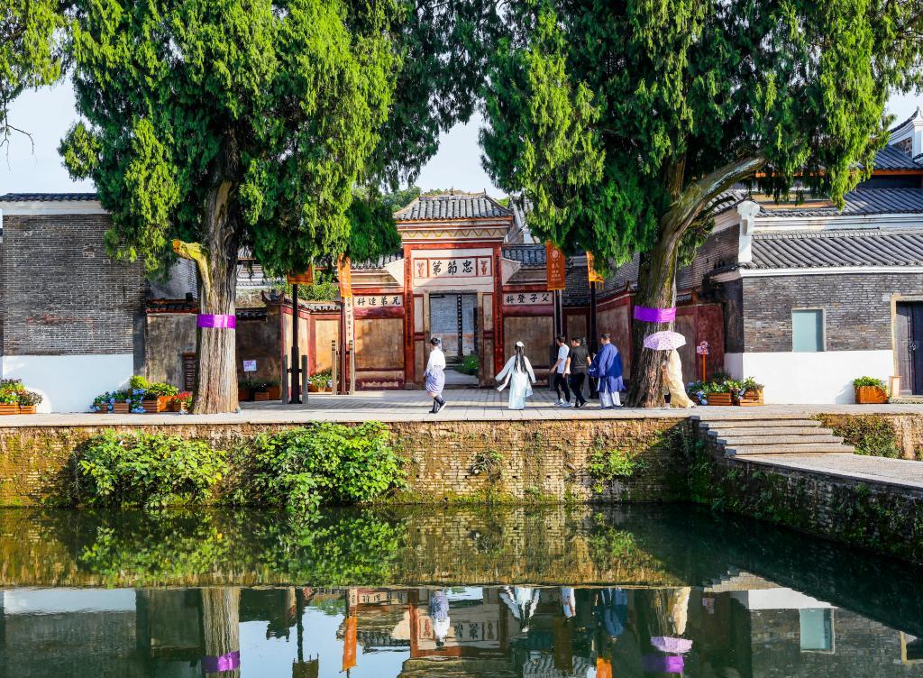 吉安古稱廬陵,釣源古村因歷史上交通便利、物阜民豐,鼎盛時(shí)期被稱為廬陵“小南京”。從高處俯瞰,古村規(guī)劃根據(jù)地勢(shì)高低順勢(shì)而為,以八卦布局,疏密有致、移步換景。村內(nèi)有150棟明清贛派建筑,道路整潔、流水清澈,青磚黛瓦被2.6萬(wàn)余棵古樟樹環(huán)繞。
