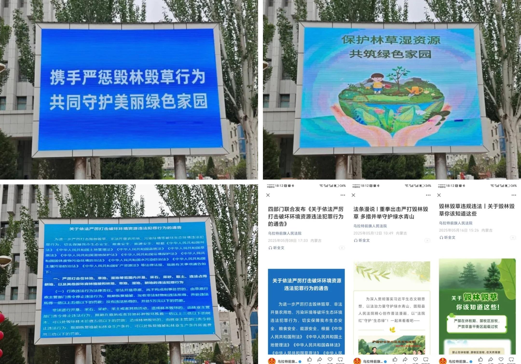 為鞏固宣傳成效,營造濃厚宣傳氛圍,烏拉特前旗人民法院開展了形式多樣的宣傳舉措。一是利用戶外LED電子顯示屏圍繞毀林毀草主題每日循環(huán)播放圖片及視頻;二是同時(shí)在5個(gè)基層法庭公示欄等顯眼位置張貼《關(guān)于嚴(yán)厲打擊毀林毀草違法犯罪行為的通告》等海報(bào)10余張;三是積極利用微信公眾號(hào)等多媒體平臺(tái),轉(zhuǎn)發(fā)有關(guān)毀林毀草的相關(guān)文章及法律條文,引導(dǎo)群眾從“被動(dòng)守法”轉(zhuǎn)向“主動(dòng)護(hù)綠”。