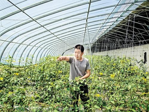 蔬菜大棚產(chǎn)業(yè)的發(fā)展還帶動了當(dāng)?shù)卮迕窬蜆I(yè)。村民劉海燕是一座黃瓜種植大棚的老員工,自從黃瓜大棚建成后,她就在此工作?!耙荒昴軖暌蝗f五六千元,還能照顧家里,挺知足?!碧崞鹪诩议T口工作的感受,劉海燕說。