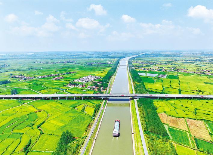 江漢運河荊門市沙洋縣李市鎮(zhèn)至后港鎮(zhèn)段,運河、橋梁、稻田交相輝映。