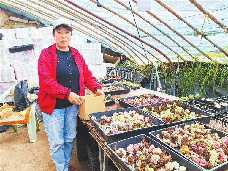 “瞧這些多肉植物小巧可愛,讓城里人親近大自然吧,網上賣得很火。”村民張淑英邊打包裝邊說,“通常老板們上午直播帶貨,下午我們就按照貨單挑貨、抖土、晾干,再裝貨,保持多肉植物不爛根。平時打理好這些植物,活很輕松,月收入2800元,還能兼顧種好家里5畝地?!?/p>