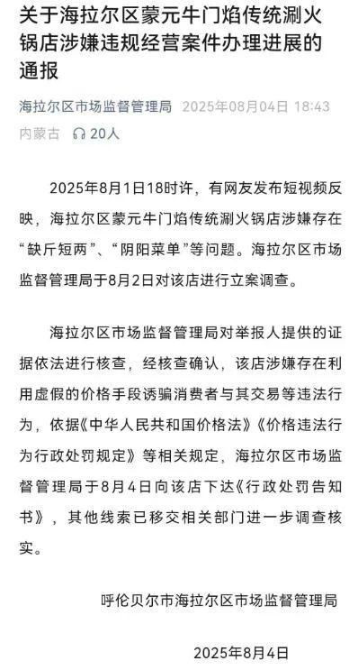 8月2日,海拉爾區(qū)市場監(jiān)管局也展開立案調查。最新通報顯示,8月4日,內蒙古呼倫貝爾市海拉爾區(qū)市場監(jiān)督管理局針對涉事火鍋店涉嫌違規(guī)經營一案向該店下達了《行政處罰告知書》。