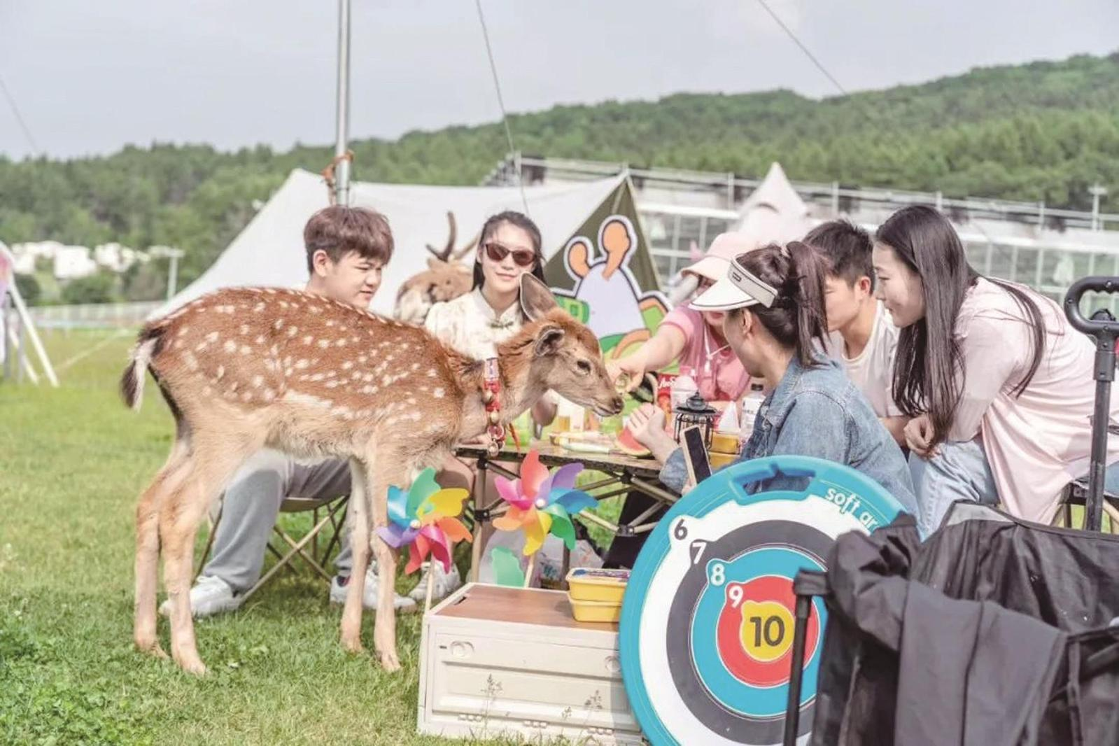在長(zhǎng)春市雙陽(yáng)區(qū)神鹿峰景區(qū),游人與景區(qū)梅花鹿互動(dòng)。