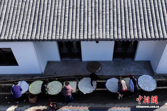 1月8日,在蔡家橋鎮(zhèn)朱旺村,村民晾曬加工好的年糕。(無人機(jī)照片)中新社記者 儲瑋瑋 攝