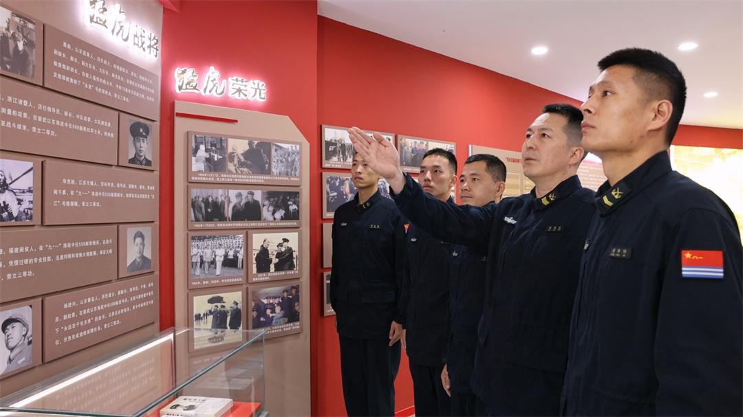 “以前的艦艇裝備簡(jiǎn)陋,先輩們靠著對(duì)黨的絕對(duì)忠誠(chéng),在海上槍林彈雨中殺出一條血路?,F(xiàn)在裝備先進(jìn)了,但忠誠(chéng)的底色不能變,越是走得遠(yuǎn)、沖在前,越不能偏離航向?!奔t河艦一級(jí)軍士長(zhǎng)韓建廷站在文化長(zhǎng)廊前對(duì)年輕艦員說。