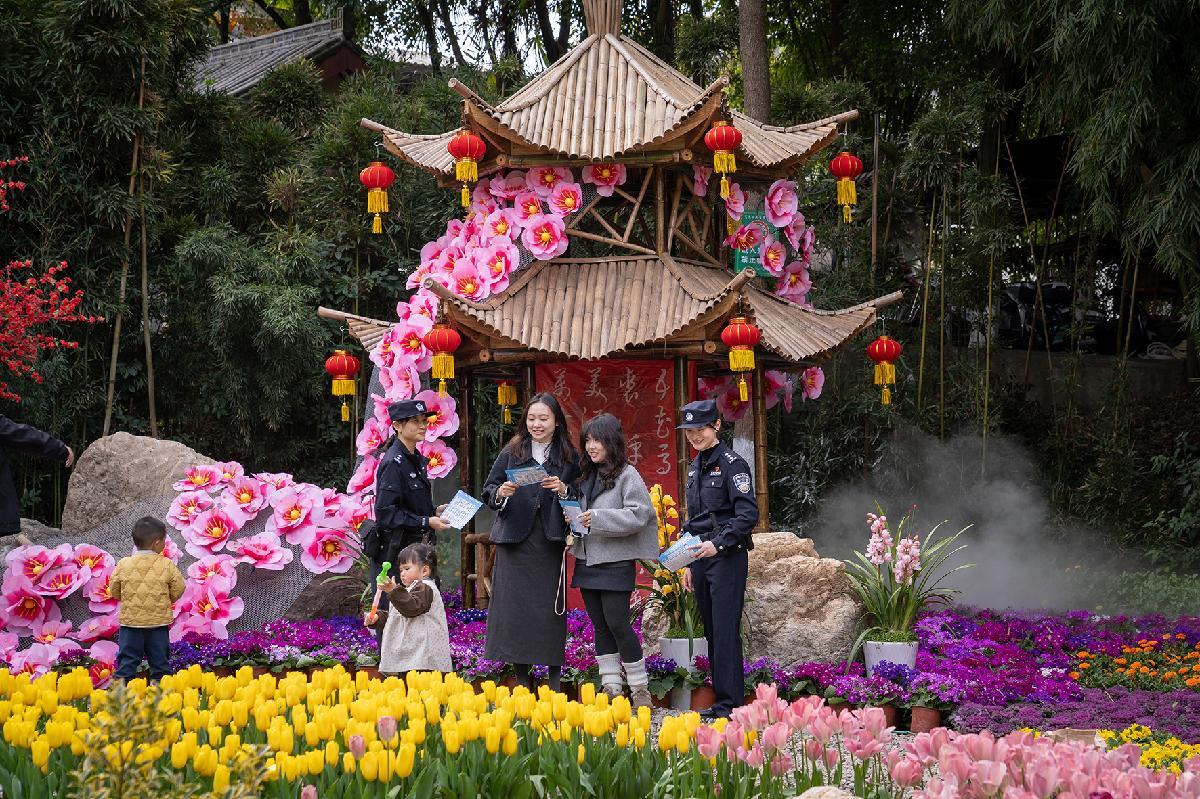 2月26日,四川省綿陽市公安局游仙區(qū)分局涪江派出所民警在富樂山公園向游客宣講反詐知識(shí)。