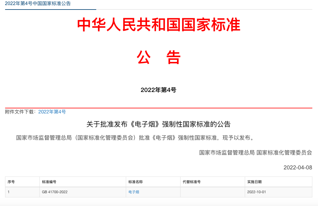 據(jù)國家標(biāo)準(zhǔn)化管理委員會官方網(wǎng)站消息,近日,國家市場監(jiān)督管理總局、國家標(biāo)準(zhǔn)化管理委員會批準(zhǔn)《電子煙》強(qiáng)制性國家標(biāo)準(zhǔn),現(xiàn)予以發(fā)布,自2022年10月1日起實(shí)施。