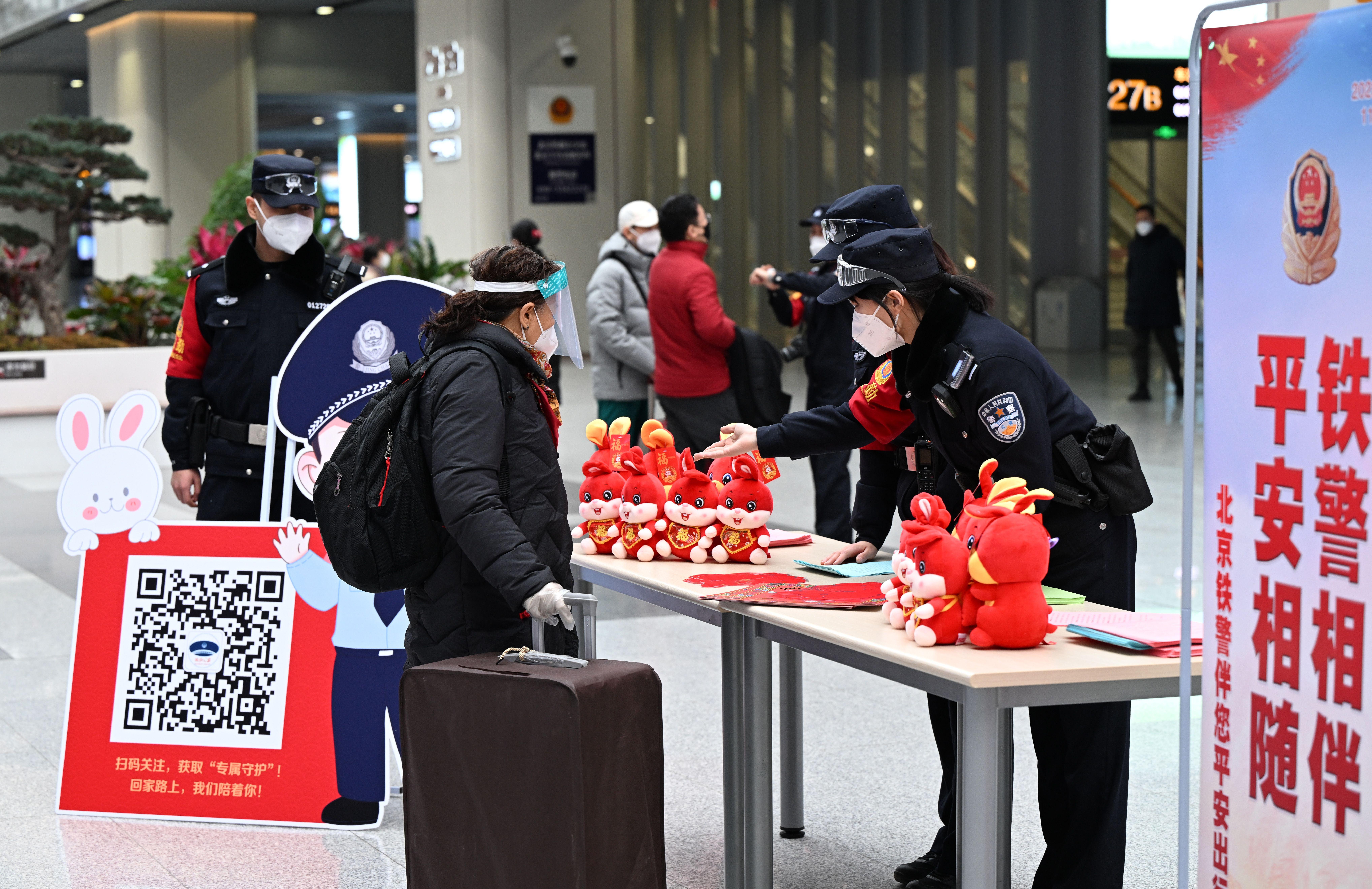 1月7日是春運首日,北京鐵路警方在北京站、北京西站、北京南站、北京北站、北京豐臺站、北京朝陽站、清河站、張家口站、承德南站、廊坊站等10大客流集中的火車站同時開展了春運安全宣傳活動。圖為豐臺站派出所民警在“鐵警相伴 平安相隨”宣傳活動展臺前,邀請旅客關(guān)注春運便民服務(wù)措施“安全出行”二維碼。