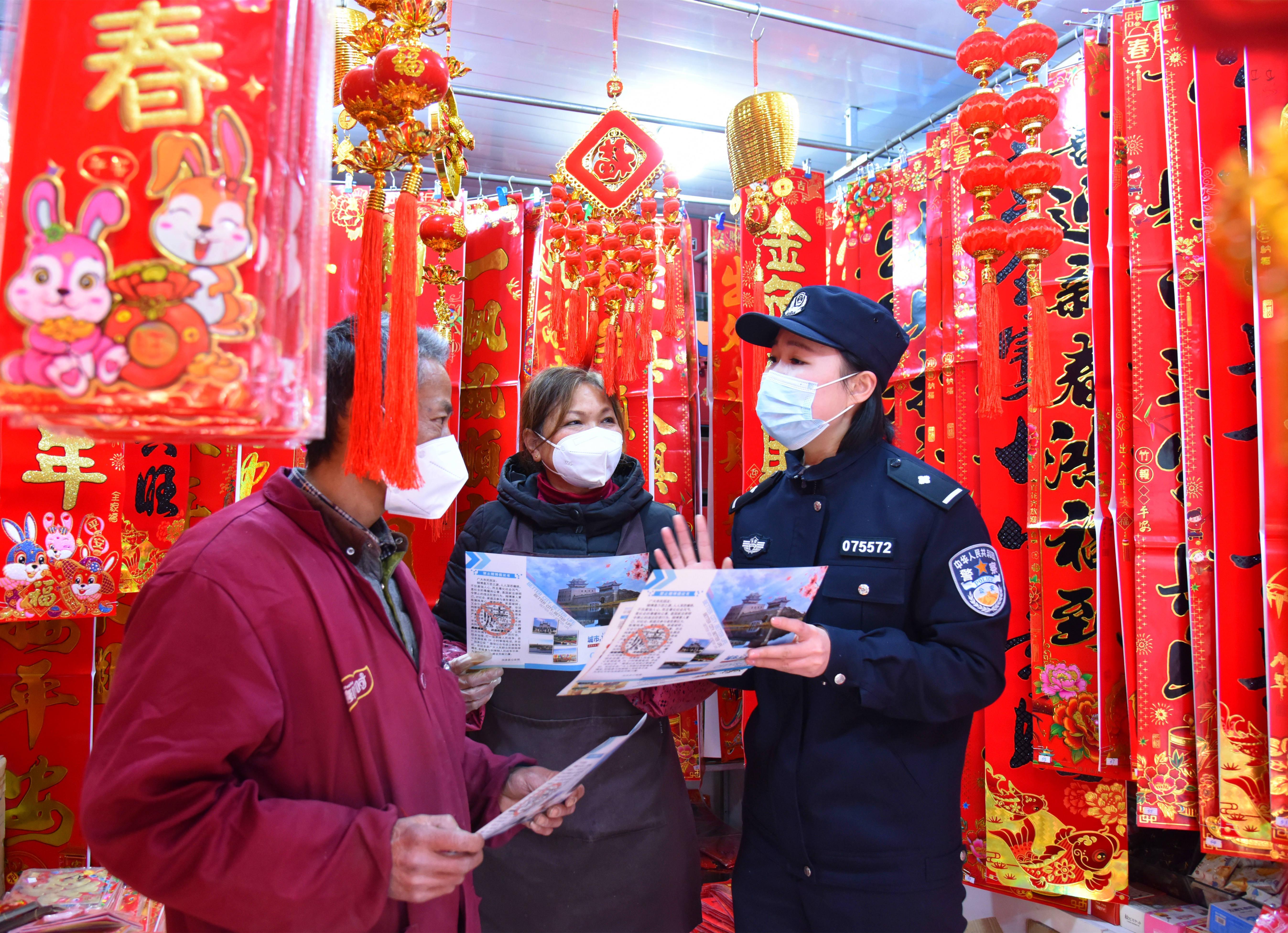 春節(jié)來(lái)臨,正值群眾購(gòu)置年貨的高峰期,安徽省當(dāng)涂縣公安局姑孰派出所民警深入轄區(qū)年貨市場(chǎng),向經(jīng)營(yíng)戶(hù)宣傳防火、防騙、防盜等平安常識(shí),全力守護(hù)轄區(qū)年貨市場(chǎng)平安繁榮,確保人民群眾歡度新春佳節(jié)。圖為1月4日,民警走訪年貨市場(chǎng)店主,開(kāi)展禁毒禁賭安全防范宣傳。